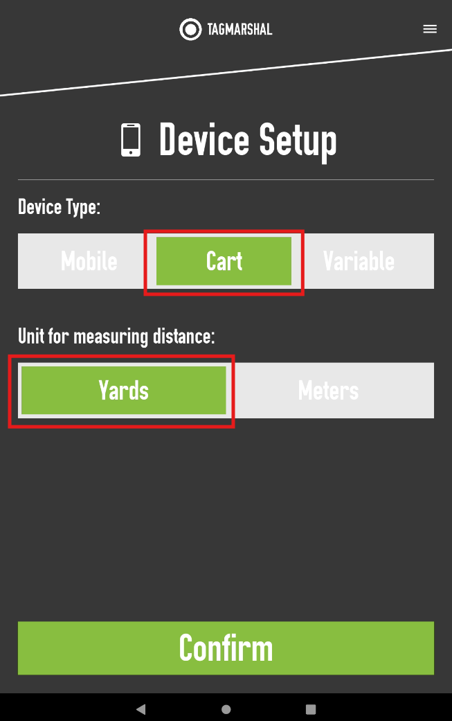 On the device setup page, select Cart as the vehicle type and choose your preferred distance measurement (Yards or Meters).