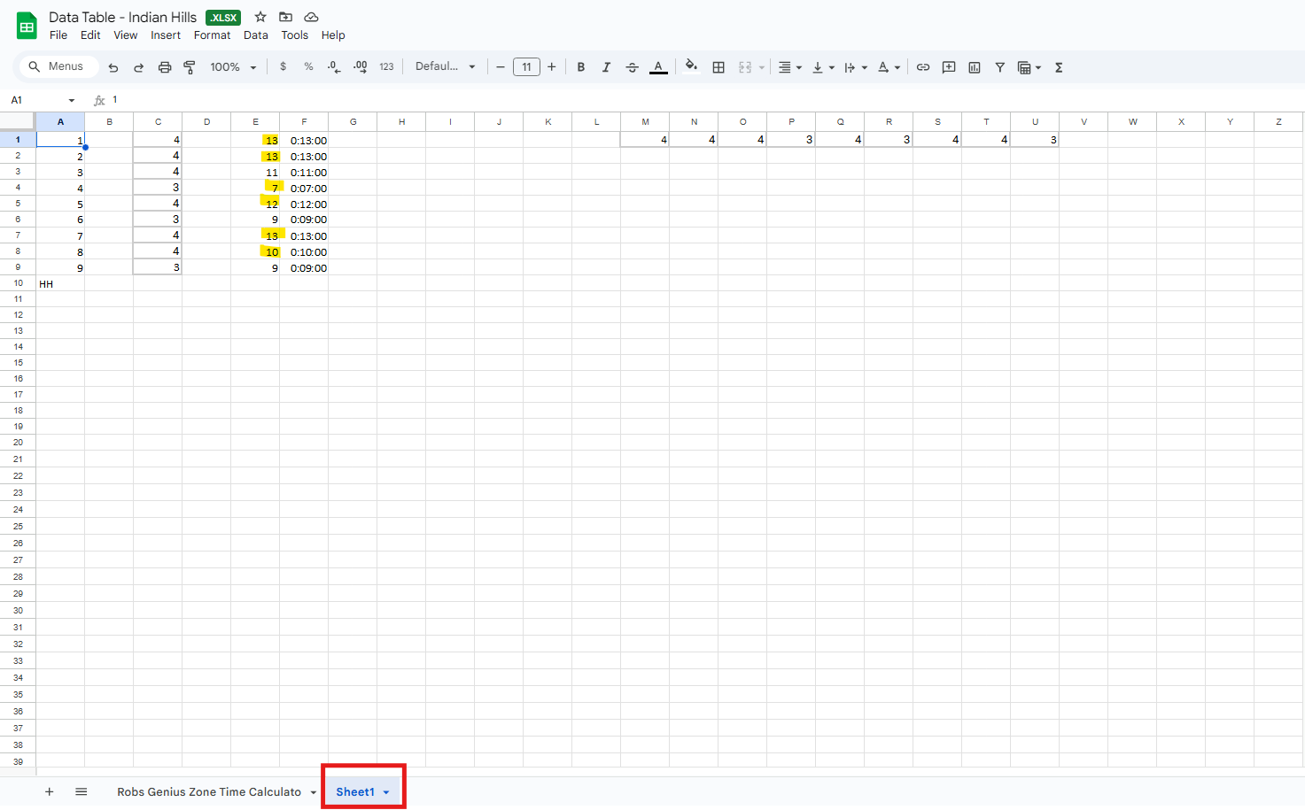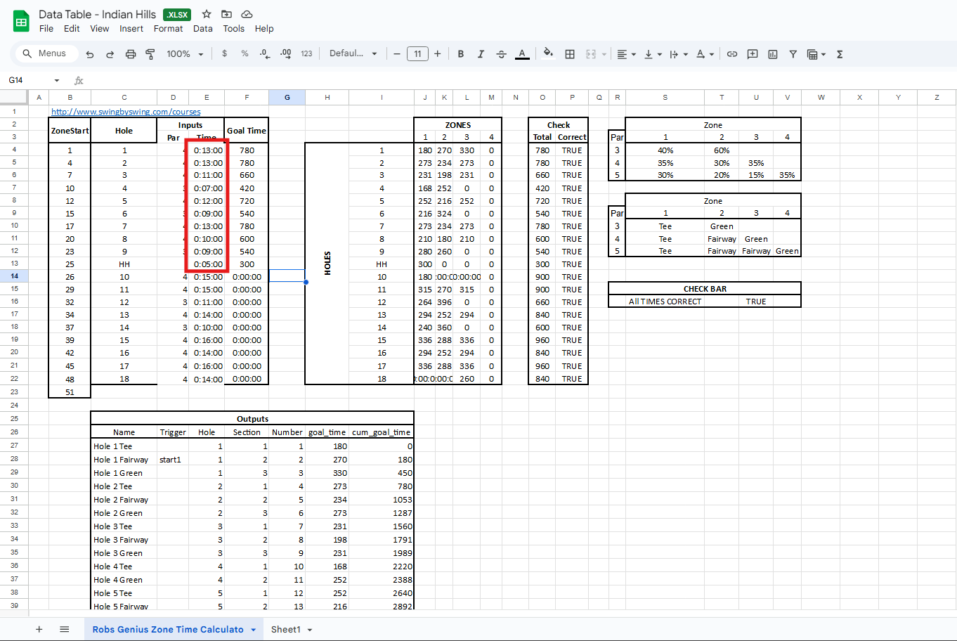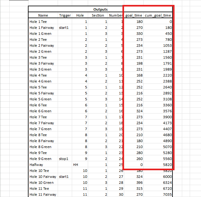 We'll take this information and add the updated times to the second sheet in the Data Table for 906 Golf Course, take note of which hole numbers are being adjusted. In this case, it's holes 1, 2, 4, 5, 7, and 8. For this course, you'll make the adjustment to column E. You'll see that these adjustments will automatically update column F.