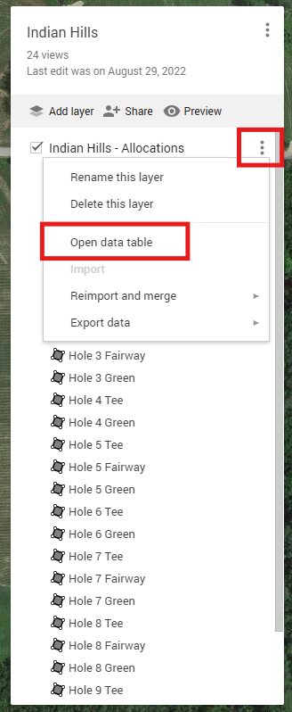 We'll use the goal time and cumulative goal time to update the sections in the KML file. After we've updated the hole times, we'll check for any errors. To open the data table on the KML file you'll need to click on: