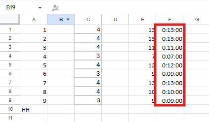 We'll now copy (ctrl + C) column F with the minutes and past it in the first sheet on the data table.